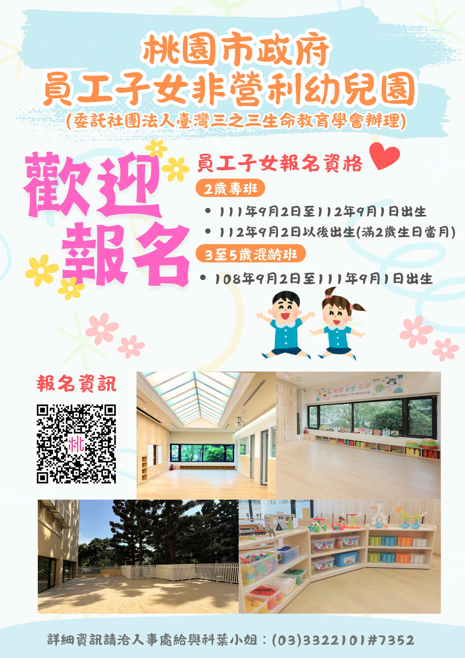 請參閱附件「桃園市政府員工子女非營利幼兒園(委託社團法人臺灣三之三生命教育學會辦理)員工候補登記入園報名表」及報名DM。