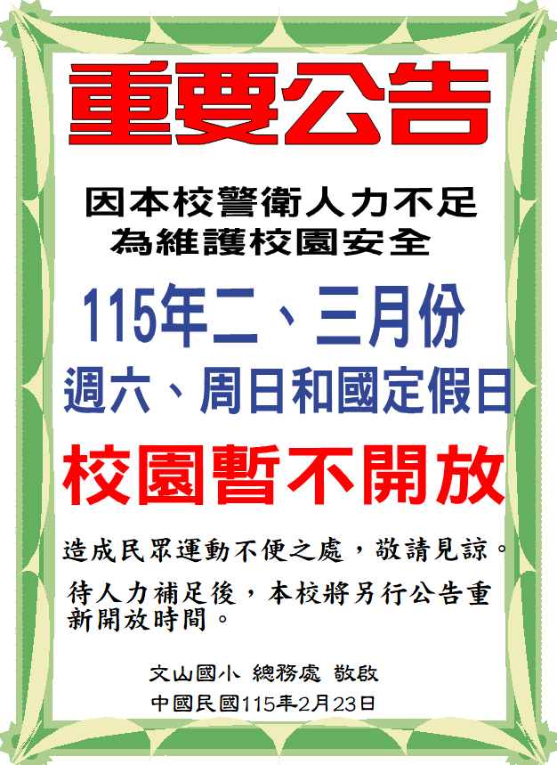 感謝您長期以來對本校校園的支持與愛護。因本校目前仍在辦理警衛人員徵聘作業,現階段人力不足,為確保校園安全與秩序,從2月27日起校園將暫停假日對外開放予社區民眾入校運動。