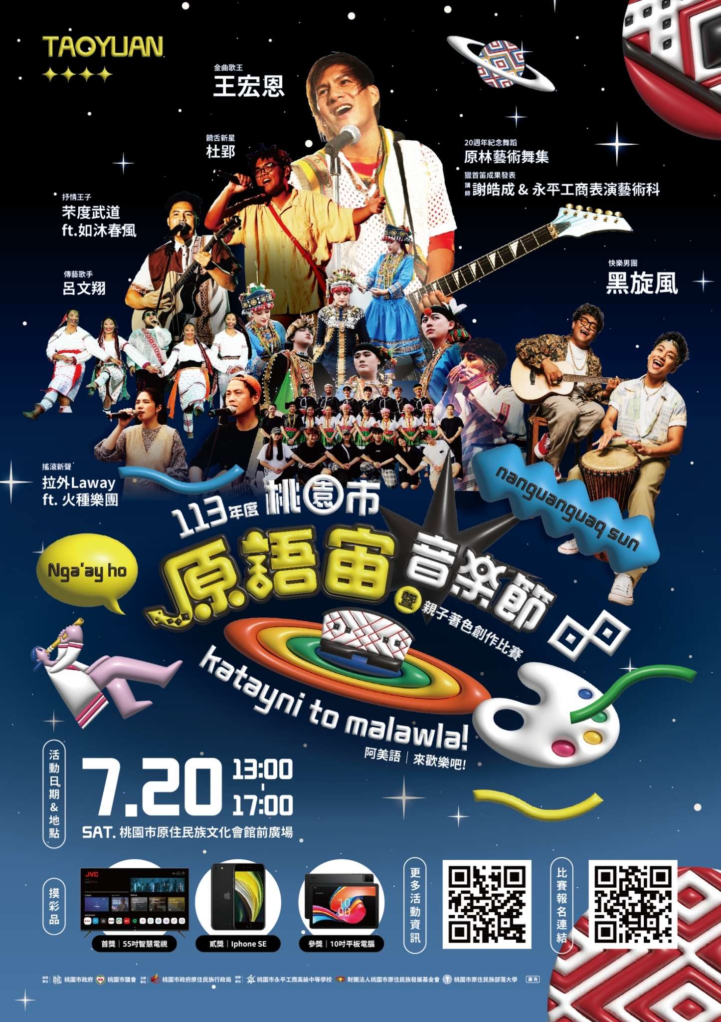 | 一、 | 為歡慶文化會館20週年重要時刻,今年度桃園市原住民族文化會館將辦理原語宙音樂節暨親子著色活動,以延續桃園市原住民族部落大學親子共學教學模式,期待將族群文化之美深入在民眾心中,同時達到族群主流化。 |