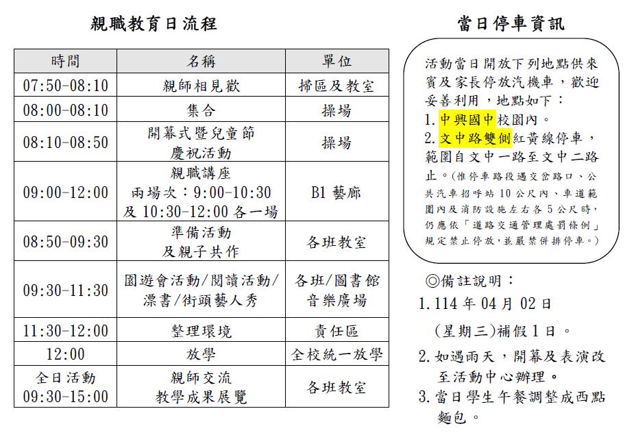 感謝您一直以來對校務活動的關心與支持,為加強親師之聯繫互動以及共同關心經營優質教育,本校訂114年3月29日(六)舉辦親職教育日暨兒童節慶祝活動~友善校園 SHINE亮你心,在此誠懇地邀請您能撥冗參加,與孩子共度難忘的週末,為孩子的成長留下珍貴的紀錄!
