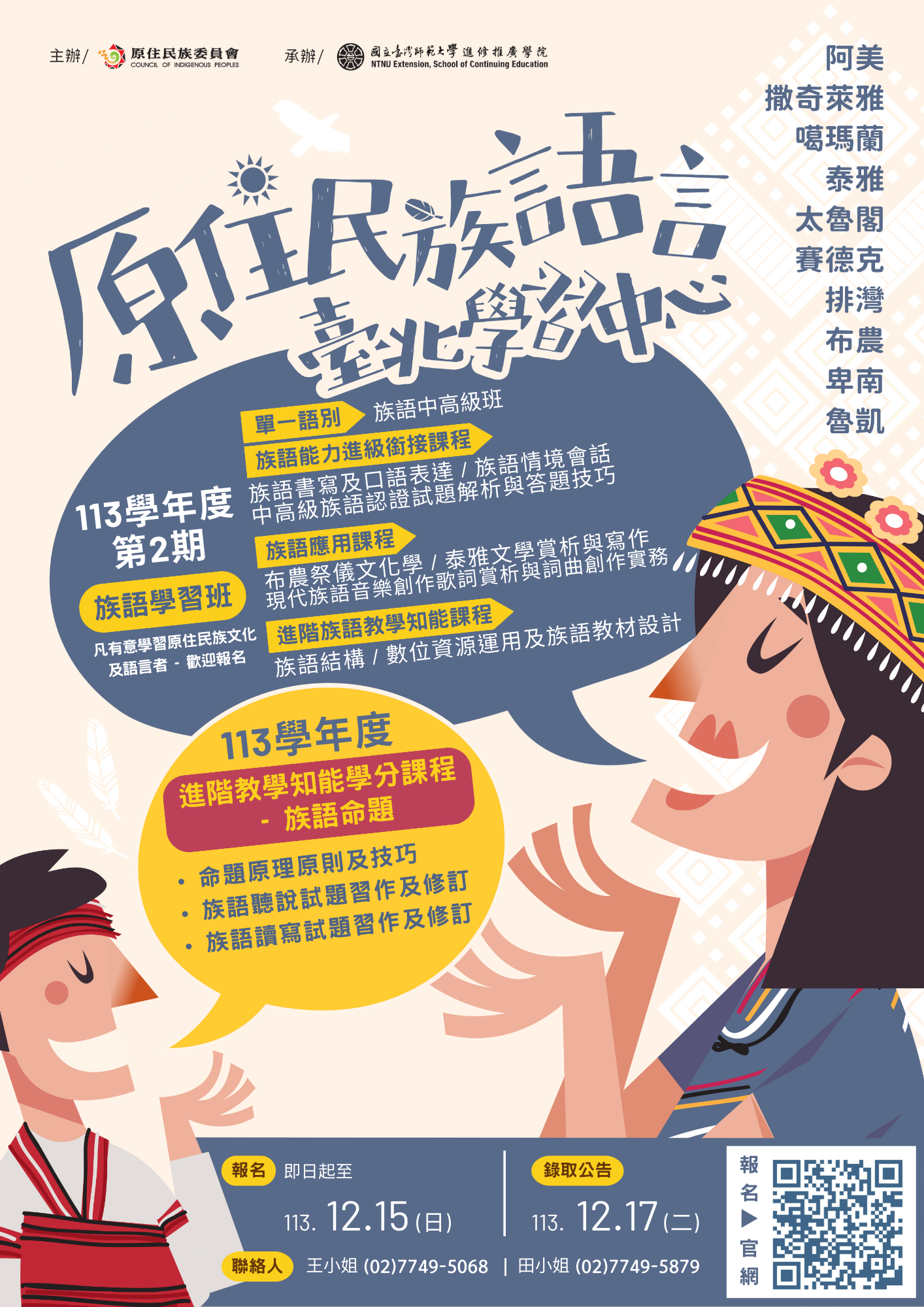 | 二、 | 為協助培育原住民族語言師資,強化其命題能力,期有效提升評量設計的質與量,同時協助強化命題技巧之傳承,國立臺灣師範大學於113學年度持續辦理旨揭專班。 |
