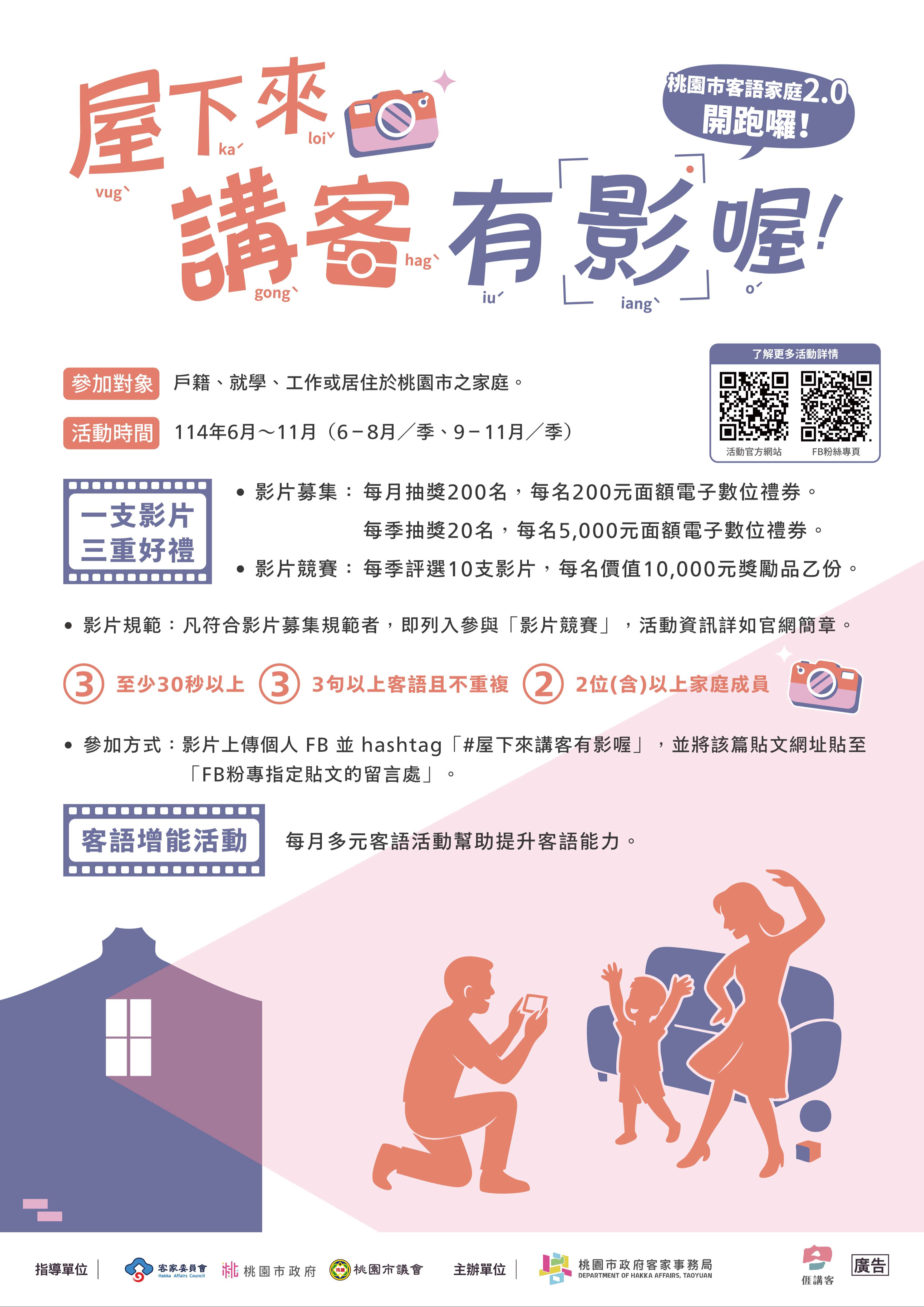 | 二、 | 本案影片募集及競賽自即日起至114年11月30日止,上傳講客影片即可參與每月(季)抽獎及競賽拿萬元獎品,另辦理客語增能活動共60場次,所有活動皆可免費參加,活動詳情請至活動官網(https://hakkadata.tycg.gov.tw/21809/)查詢。 |